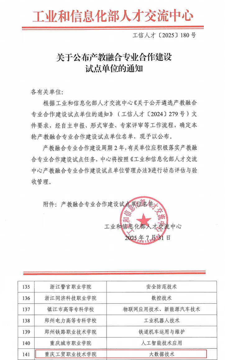 近日,工业和信息化部人才交流中心公布了《产教融合专业合作建设试点单位名单》(工信人才〔2025〕180号)。此次遴选,全国共评选高职院校144所,重庆工贸职业技术学院人工智能学院大数据技术专业成功入选。