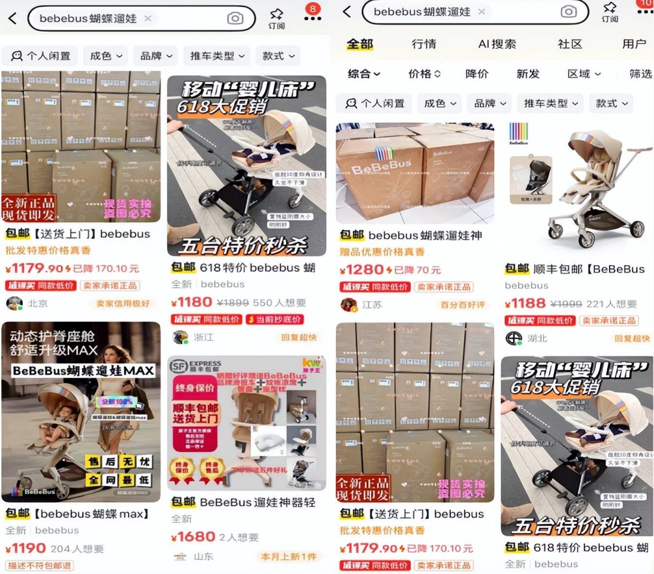 AI蓝媒汇在闲鱼上搜索BeBeBus蝴蝶遛娃车发现,鲜有二手转卖者,更多的是打着“全新正品”标签的商家。