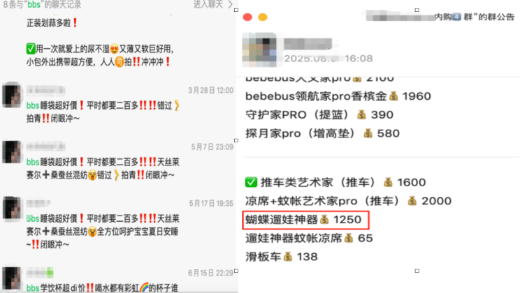 事实上,不仅二手平台,在社交媒体上还充斥着大量的宝妈内购群,具体操作是:要什么产品,查看群公告价格,微信转账下单。价格通常要大幅低于官方价,以BeBeBus的蝴蝶遛娃车为例,内购群1250元比官方售价低了约30%。